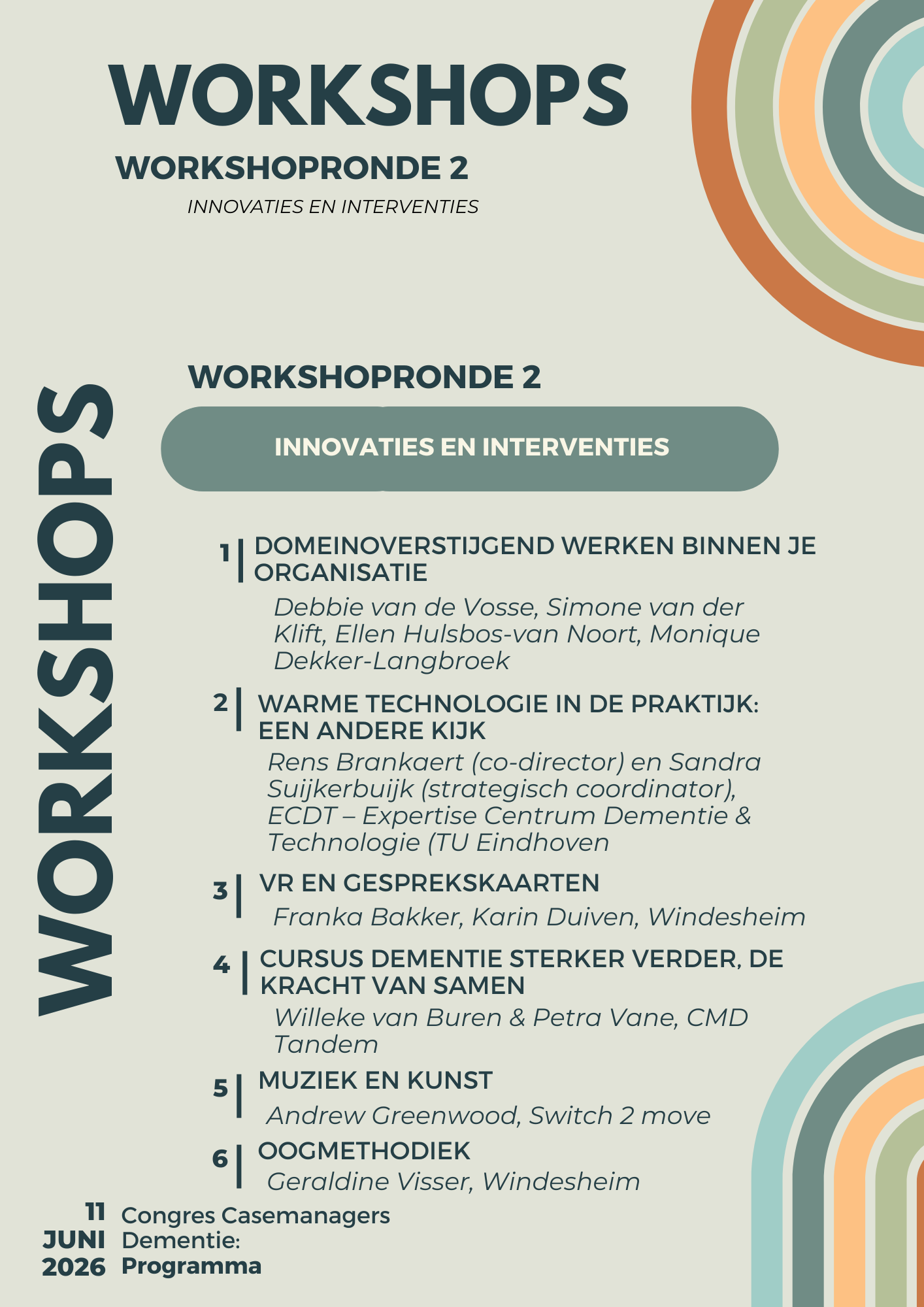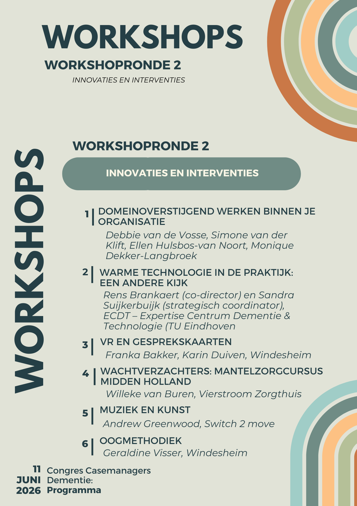 In deze workshop nemen Rens en Sandra je mee in de benadering van Warme Technologie – een perspectief dat technologie niet als oplossing ziet, maar als middel om samen beter te leven met dementie. Na een korte introductie gaan deelnemers in kleine groepen aan de slag: eerst met vragen en uitdagingen uit de eigen praktijk, daarna in een creatieve brainstorm over wat er beter kan en hoe technologie daar een rol in kan spelen. De workshop sluit af met concrete handreikingen waar je de volgende dag mee aan de slag kunt.