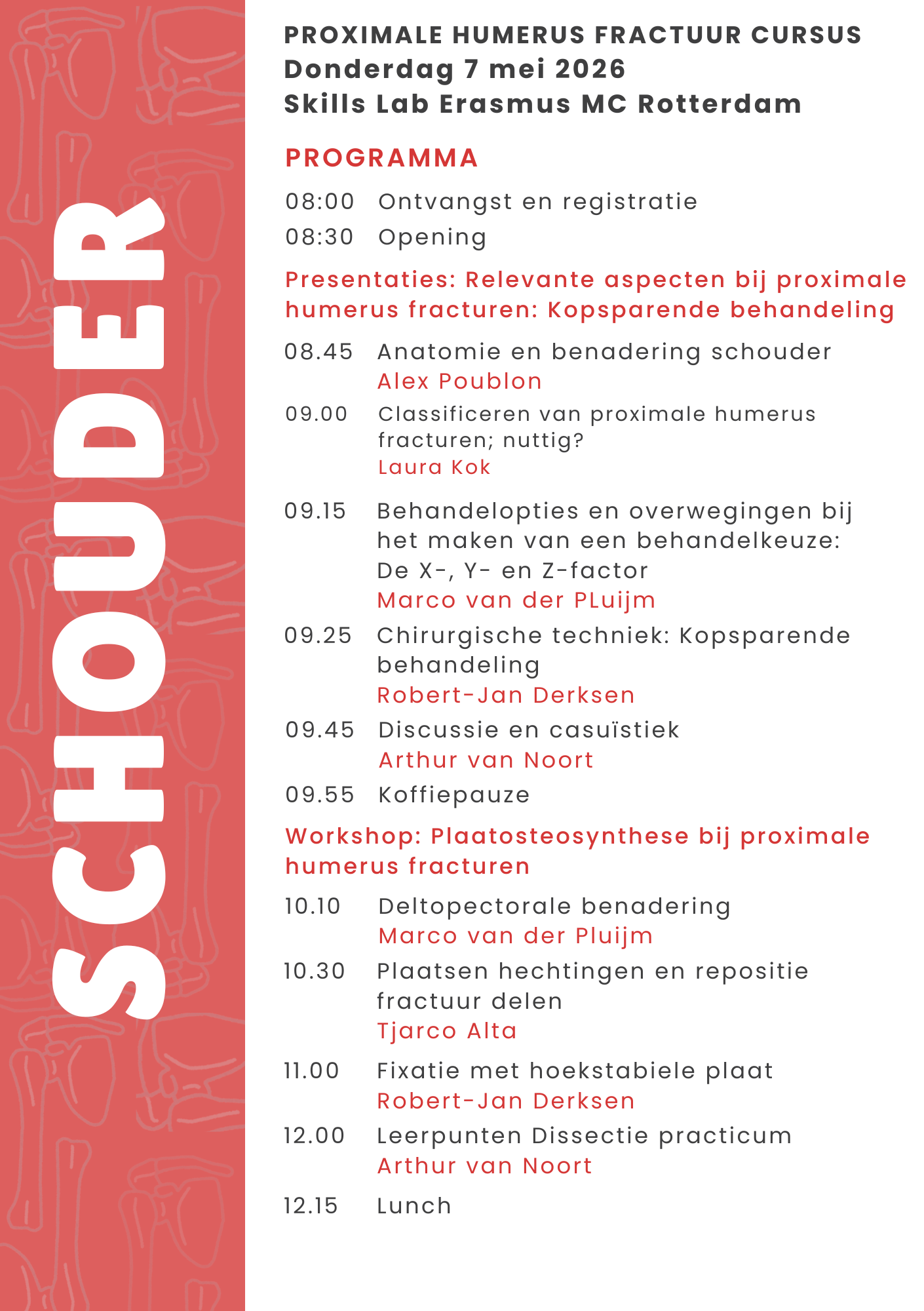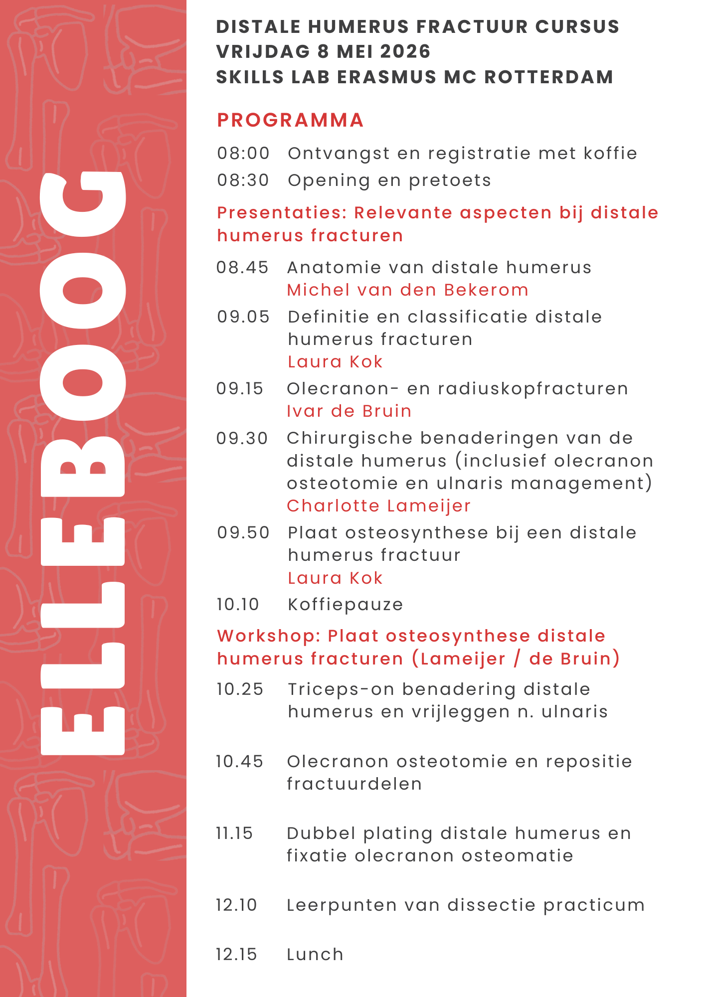 Op donderdag 7 en vrijdag 8 mei 2026 vindt de Proximale en Distale Humerus Fractuur Cursus plaats in het SkillsLab van het Erasmus MC Rotterdam.