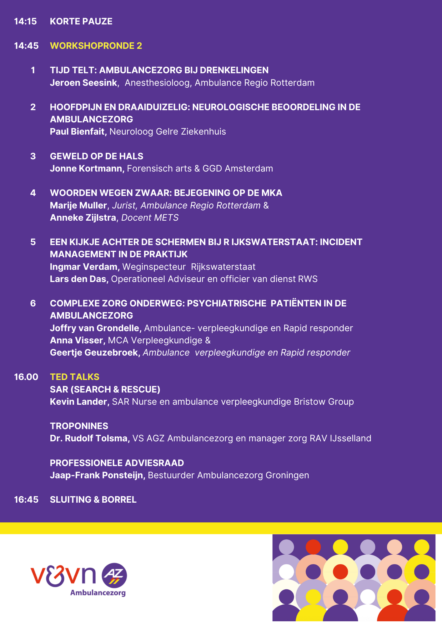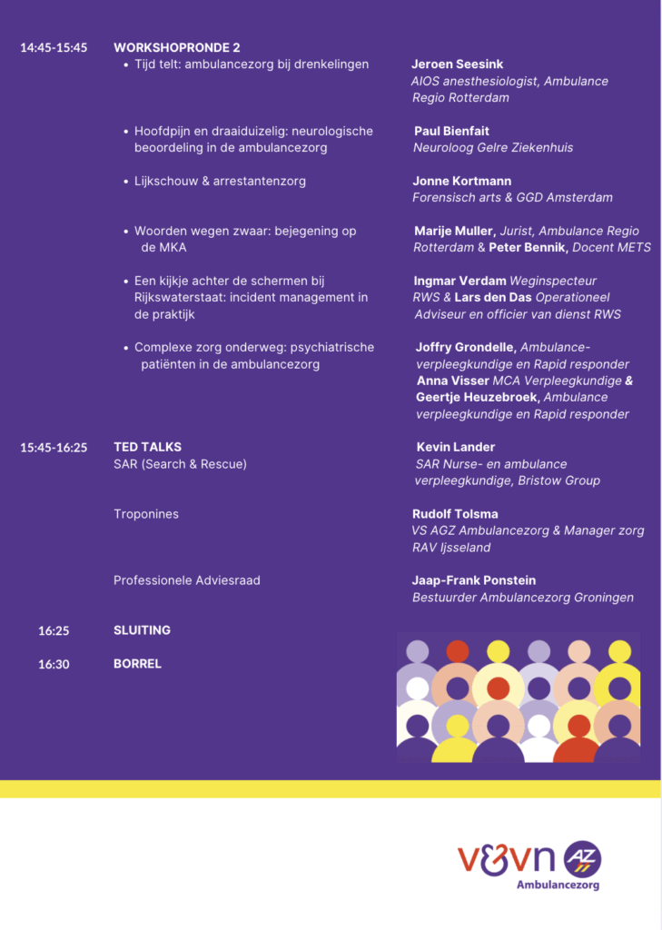 Dit congres is dé ontmoetingsplek voor alle professionals in de ambulancezorg en andere belangstellenden met hart voor acute zorg. Een dag vol verdieping, uitwisseling en inspiratie – georganiseerd dóór en vóór het werkveld, met de inzet van onze betrokken vakgroepen.