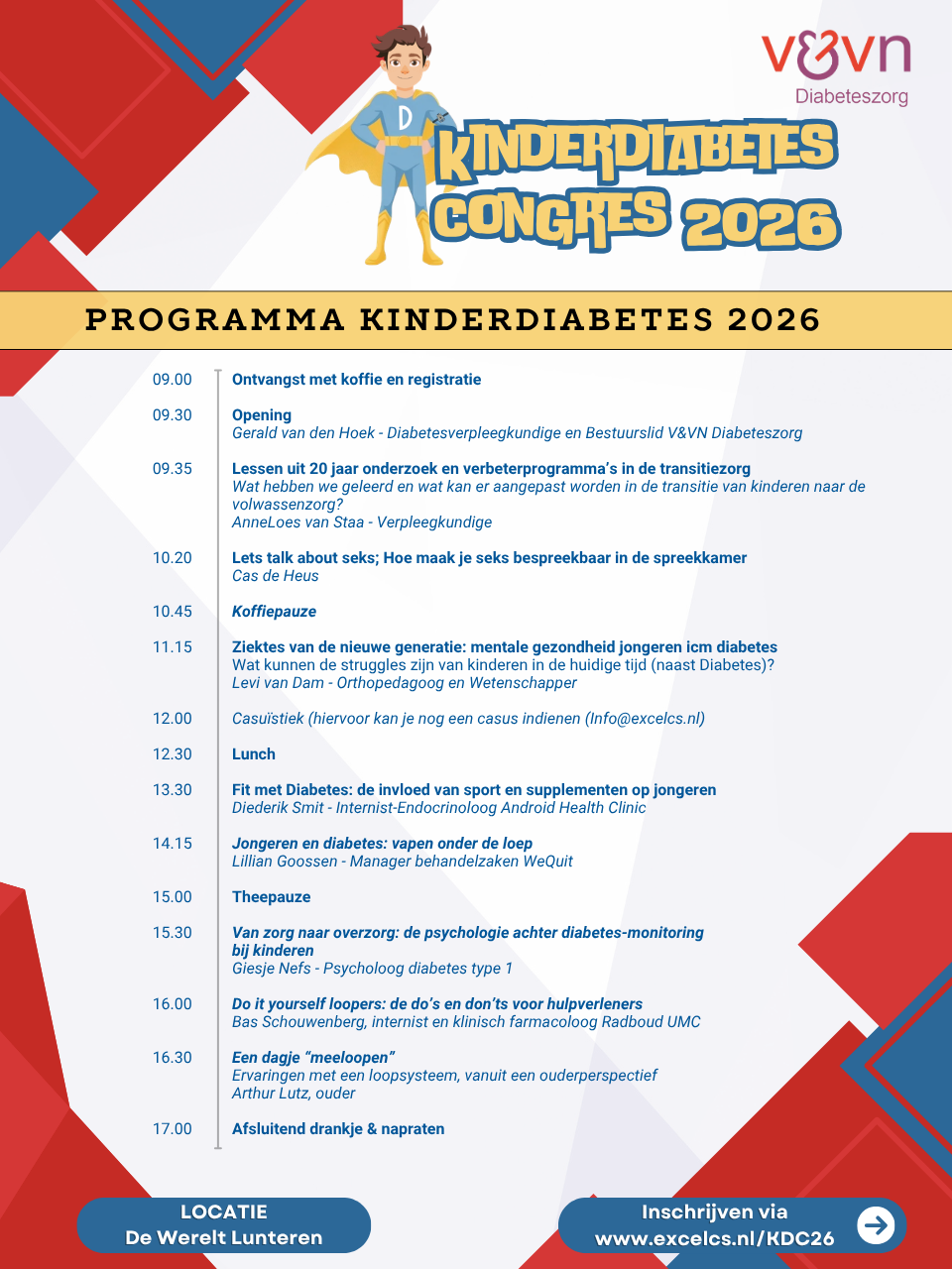In juni 2026 organiseert V&VN het Kinderdiabetes congres, een uniek evenement gericht op zorgprofessionals die werken met kinderen met diabetes. Dit congres biedt boeiende lezingen, interactieve workshops en praktijkgerichte sessies die inspelen op de nieuwste ontwikkelingen en uitdagingen binnen de kinderdiabeteszorg. Het is bovendien dé gelegenheid voor bedrijven en sponsoren om direct in contact te komen met deze gespecialiseerde zorgprofessionals.